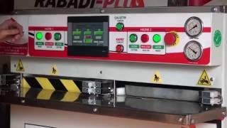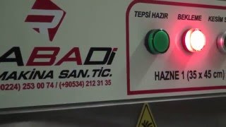 Rabadi Plus fully automatic baklava slicing machine slices 2000+ trays per day with precision. PLC controlled, touchscreen, interchangeable blade cassette system.